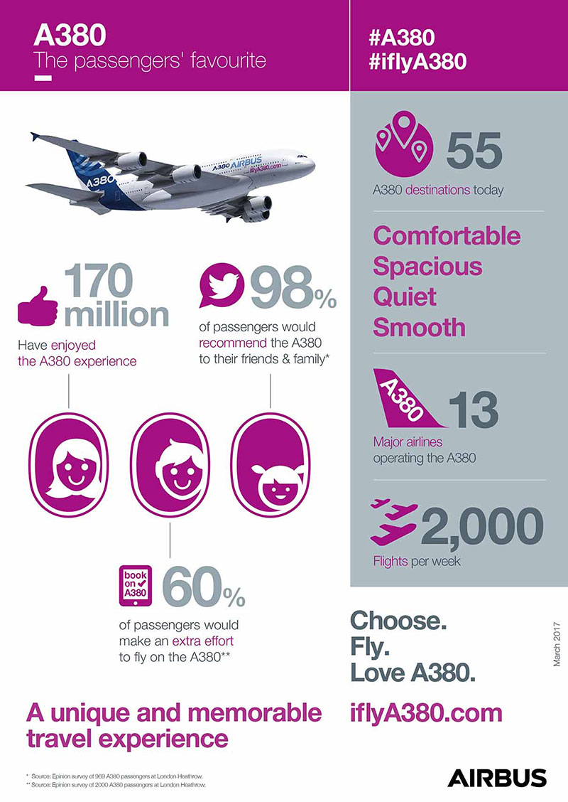 Το αγαπημένο αεροσκάφος των επιβατών: Το πιο ευρύχωρο αεροσκάφος στον κόσμο έχει ένα αποδεδειγμένο ιστορικό με τους επιβάτες, σύμφωνα με ανεξάρτητη έρευνα, το 98% των επιβατών ενός A380 θα συνιστούσα σε φίλους & συγγενείς να ταξιδέψουν με ένα A380, και το 60% από αυτούς είναι πρόθυμοι να κάνουν την προσπάθεια ώστε να ταξιδέψουν με ένα τέτοιο αεροσκάφος.