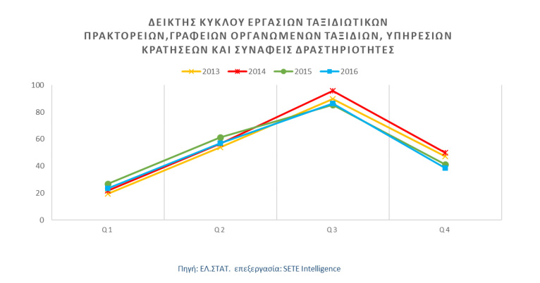 Ο ΔΚΕ στις δραστηριότητες των ταξιδιωτικών πρακτορείων, γραφείων οργανωμένων ταξιδιών, υπηρεσιών κρατήσεων και συναφείς δραστηριότητες του Δ΄ τριμήνου 2016, παρουσίασε μείωση -6,3% σε σύγκριση με τον αντίστοιχο δείκτη του Δ΄ τριμήνου 2015, έναντι μείωσης -17,6% που σημειώθηκε κατά τη σύγκριση της αντίστοιχης περιόδου του έτους 2015 προς το 2014.Ο δείκτης κύκλου εργασιών στις δραστηριότητες των ταξιδιωτικών πρακτορείων, γραφείων οργανωμένων ταξιδιών, υπηρεσιών κρατήσεων και συναφείς δραστηριότητες του Δ΄ τριμήνου 2016, σε σύγκριση με τον αντίστοιχο δείκτη του Γ΄ τριμήνου 2016, παρουσίασε μείωση -55,4%, λόγω της εποχικότητας στον κλάδο. Ο ΔΚΕ των ταξιδιωτικών πρακτορείων, παρουσιάζει το δεύτερο ιστορικό χαμηλό για το Δ’ τρίμηνο την περίοδο 2010-2016, ειδικότερα έχει τιμή 39 το 2016, έναντι 36 το 2012.