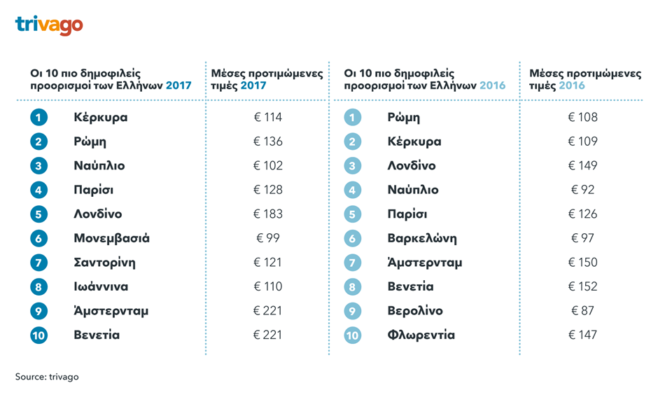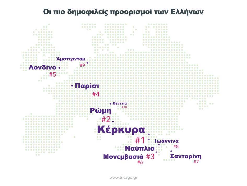 Υποσκελίστηκε μετά από τρία χρόνια από την πρώτη θέση των προτιμήσεων των Ελλήνων ταξιδιωτών η Ρώμη, παραχωρώντας την θέση της στην Κέρκυρα. Αυτό αντανακλά την γενικότερη τάση επιστροφής των Ελλήνων σε εγχώριους προορισμούς. Χαρακτηριστικά, ενώ πέρσι οι οκτώ από τους δέκα προορισμούς ήταν διεθνείς, φέτος ο αριθμός αυτός μειώθηκε στους πέντε. Πιο συγκεκριμένα, πέρσι στην πρώτη δεκάδα ήταν μόνο η Κέρκυρα και το Ναύπλιο, ενώ φέτος στη λίστα προστέθηκε η Μονεμβασιά, καταλαμβάνοντας την έκτη θέση, ακολουθούμενη από τη Σαντορίνη και τα Ιωάννινα στην έβδομη και όγδοη θέση, αντίστοιχα. Από τους διεθνείς προορισμούς το Παρίσι κατέλαβε την τέταρτη θέση με το Λονδίνο να είναι στην πέμπτη, ενώ το Άμστερνταμ και η Βενετία συμπληρώνουν τη λίστα βρισκόμενες στηνένατη και δέκατη θέση αντίστοιχα.