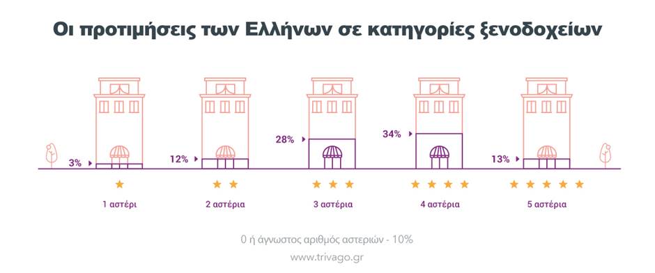 Όσον αφορά στις προτιμήσεις των Ελλήνων σε κατηγορίες ξενοδοχείων, τα τεσσάρων αστέρων είχαν την τιμητική τους, αγγίζοντας το 34% του όγκου των αναζητήσεων, ακολουθούμενα από αυτά των τριών, με 28%. Τα ξενοδοχεία πέντε αστέρων ήταν τρίτα στις  προτιμήσεις των Ελλήνων χρηστών συγκεντρώνοντας το13% των αναζητήσεων.