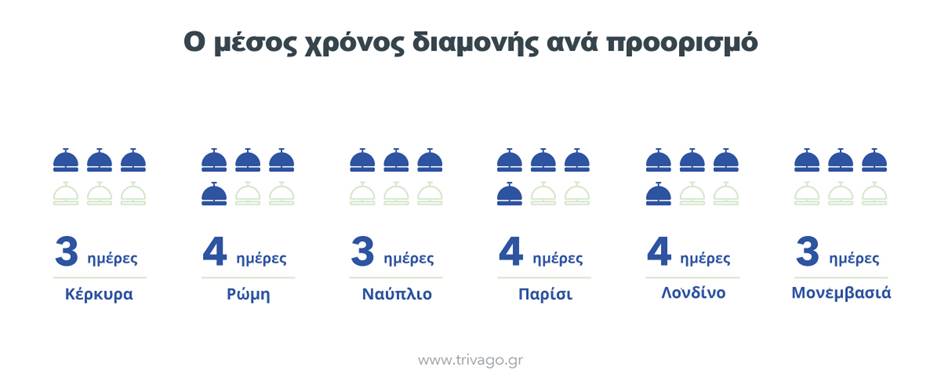 Ο μέσος χρόνος διαμονής στην Κέρκυρα, το Ναύπλιο, τη Μονεμβασιά, τη Σαντορίνη και τα Ιωάννινα είναι 3 ημέρες, ενώ στη Ρώμη, το Παρίσι, το Λονδίνο και τοΆμστερνταμ είναι 4 ημέρες, ενώ στην Βενετία είναι 3 ημέρες.