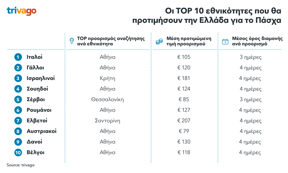 Η Αθήνα είναι ο ελληνικός προορισμός που θα προτιμηθεί κατά κόρων από τους ξένους τουρίστες το φετινό Πάσχα, με επτά από τις top δέκα εθνικότητες που θα επισκεφτούν φέτος την χώρα μας να προτιμούν την πρωτεύουσα. Πιο συγκεκριμένα, η Αθήνα προτιμήθηκε από τους Ιταλούς και τους Γάλλους, που βρίσκονται στις δύο πρώτες θέσεις της λίστας, ακολουθούμενοι από τους Σουηδούς στην τέταρτη, τους Ρουμάνους στην έκτη, τους Αυστριακούς στην όγδοη, και τους Βέλγους στηνδέκατη. Την μεγαλύτερη μέση προτιμώμενη τιμή για την Αθήνα είχαν οι Δανοί, στα 130 ευρώ, οι οποίοι βρίσκονται στην ένατη θέση της σχετικής λίστας. ΟιΙσραηλινοί προτίμησαν την Κρήτη, με την μέση προτιμώμενη τιμή να είναι 181 ευρώ, ενώ οι Ελβετοί προτίμησαν την Σαντορίνη, με την μέση προτιμώμενη τιμή να διαμορφώνεται στα 207 ευρώ. Τέλος οι Σέρβοι, οι οποίοι βρίσκονται στην πέμπτη θέση της λίστας προτίμησαν την Θεσσαλονίκη.