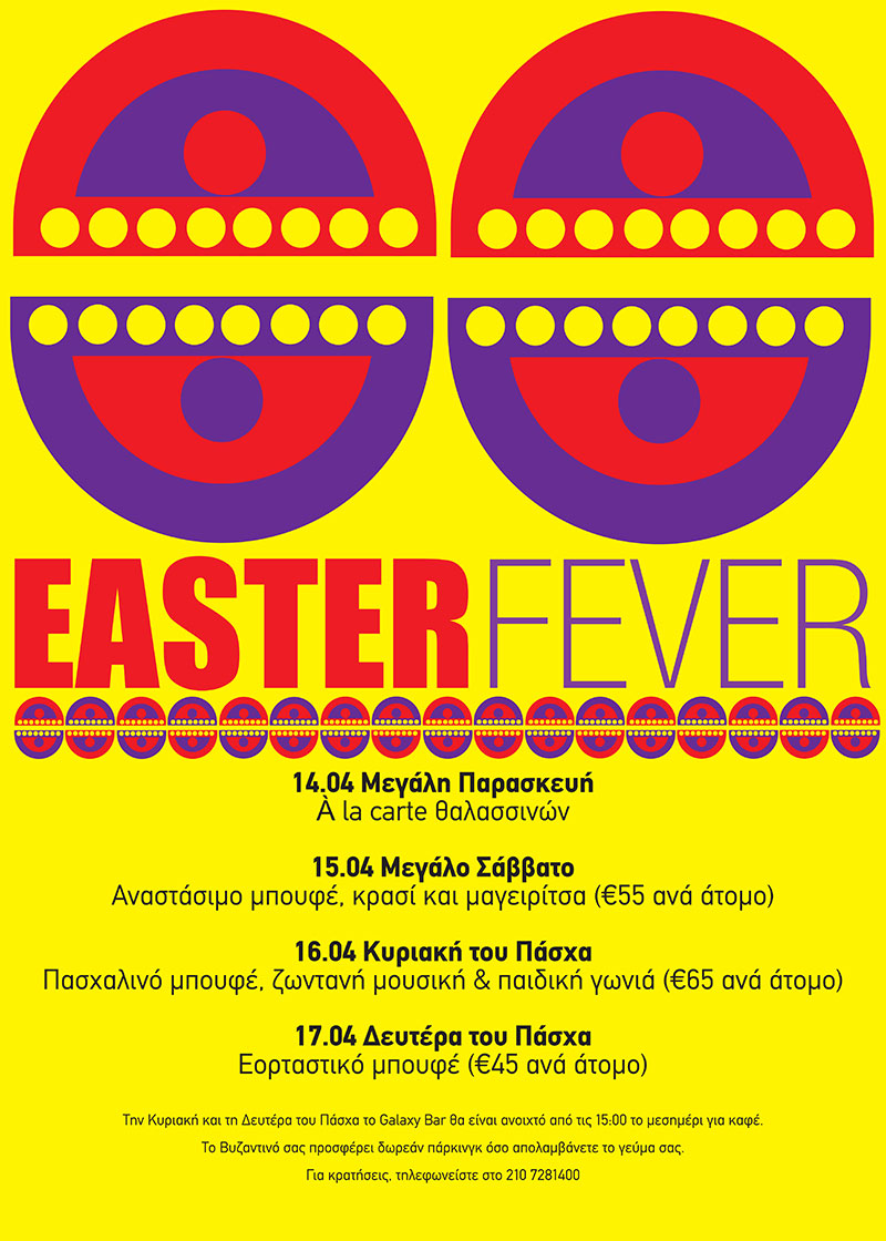 Τη Μ. Παρασκευή, το Βυζαντινό σας περιμένει με ένα à la carte menu που περιλαμβάνει νηστίσιμα εδέσματα και θαλασσινά. Το Μ. Σάββατο, το αναστάσιμο δείπνο θα έχει την απαραίτητη λαμπρότητα με παραδοσιακή μαγειρίτσα και πλούσιο μπουφέ. Την Κυριακή του Πάσχα, γιορτάστε με ψητό αρνί, κόκκινα αβγά, παραδοσιακό μπουφέ, μεγάλη ποικιλία γλυκών και ζωντανή μουσική. Σε μια χαριτωμένη, παιδική γωνιά εντός του εστιατορίου, τα παιδιά θα ζωγραφίσουν, θα παίξουν και θα διασκεδάσουν με επίβλεψη και δημιουργική απασχόληση από ανιματέρ, όσο οι γονείς θ’ απολαμβάνουν το γεύμα τους. Θα υπάρχει μάλιστα και ειδικά διαμορφωμένος, χαμηλός μπουφές για να μπορούν τα παιδιά να σερβίρονται μόνα τους κι έτσι να συμμετέχουν κι εκείνα στη διασκεδαστική εμπειρία του μπουφέ. Ο καλύτερος επίλογος για το εορταστικό τετραήμερο δεν είναι άλλος από το οικογενειακό παραδοσιακό γεύμα στο Βυζαντινό τη Δευτέρα του Πάσχα. Κατά τη διάρκεια των εορταστικών γευμάτων προσφέρεται δωρεάν πάρκινγκ. Τα παιδιά έως 5 χρονών απολαμβάνουν το φαγητό δωρεάν ενώ από 6 έως 12 ετών έχουν 50% έκπτωση.